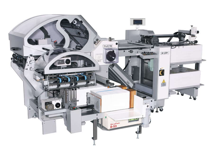 未経験の方にも稼働力を大きく促進させる正栄特許の省力排紙システム 折加工能率化の最大要素が、排紙作業の労力軽減であることは言うまでもありません。正栄は世界に先駆け大小各機種に独特の省力機構を開発していますが、特にコンビ16の立揃え結束装置はその最たるもので、省スペース・低機械コスト併せて完璧な作業効果は、ユーザー業界に好評で広く使用されています。さらに、作業が楽なPPバンドの強力結束装置が多く採用されるようになりました。(オプション)